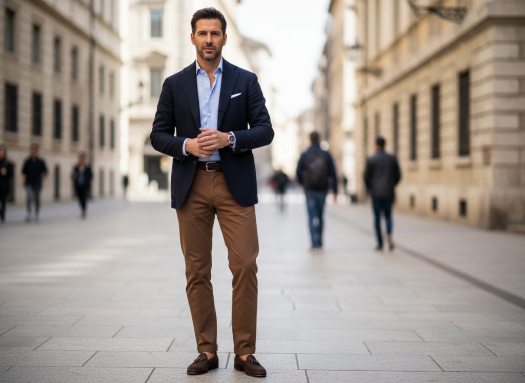 Navy pairs naturally with brown. Navy blazers over brown pants suit meetings and events. Navy shirts with brown belts look polished. Dark navy works best. Lighter blues feel casual. This pairing helps you dress sharp without effort. You rely on proven color balance seen across menswear collections and uniforms.