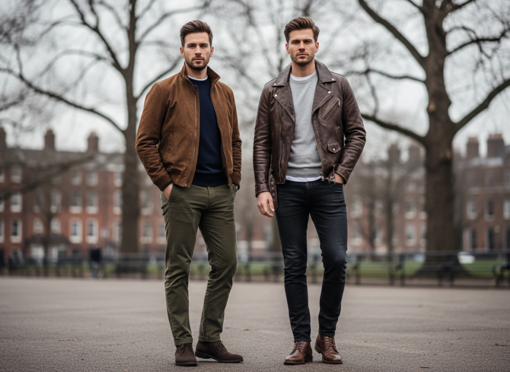 Brown jackets add warmth and depth. Pair brown leather with white or gray layers. Pair brown suede with navy or olive. Keep inner layers simple. Texture carries visual interest. You create focus without clutter. Brown jackets work best when other colors stay controlled and muted.